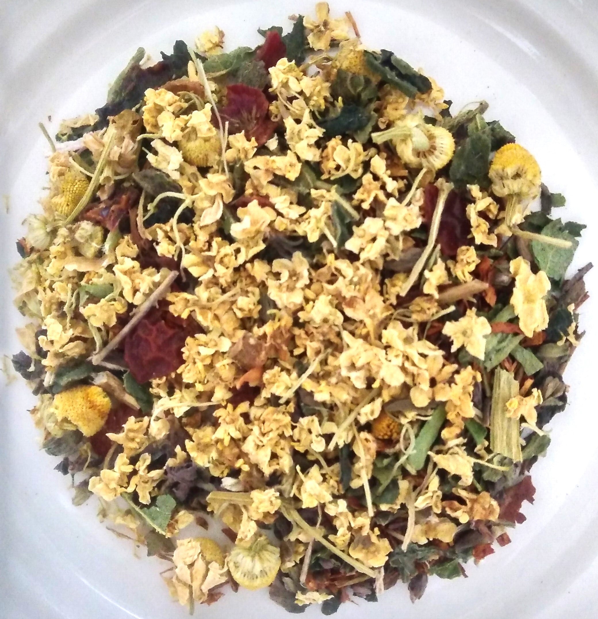 エルダーフラワー、アイブライト、ジャーマンカモミール、ルイボス、ネトル、ローズヒップ、ステビア